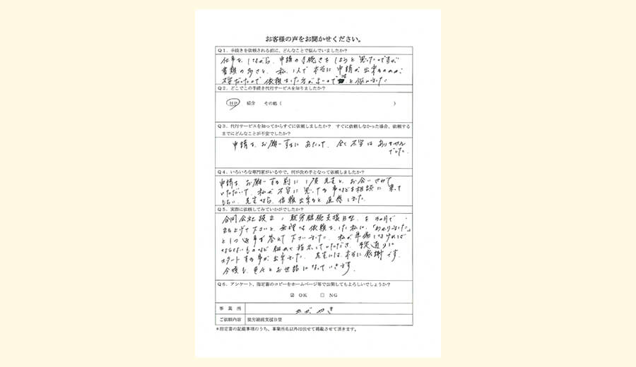 - 仕事をしながら申請の手続きをしようと思ったのですが、書類の多さと私1人で本当に申請ができるのかが不安だったので、依頼をした方がよいのではと悩みました。