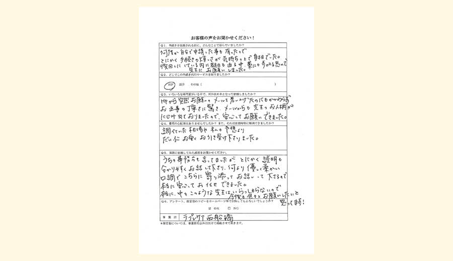 - うちの事務方も言っていましたが、とにかく説明もわかりやすくお話して下さり、何より優しく、柔らかい口調でこちらに寄り添ってお話して下さるので、本当に安心してお任せできました。