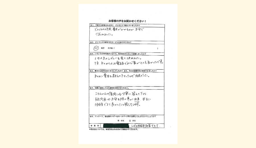 - こちらからの質問にも丁寧に答えて下さり、疑問点や不安を除く事が出来、本当に依頼出来て良かったと思っています。