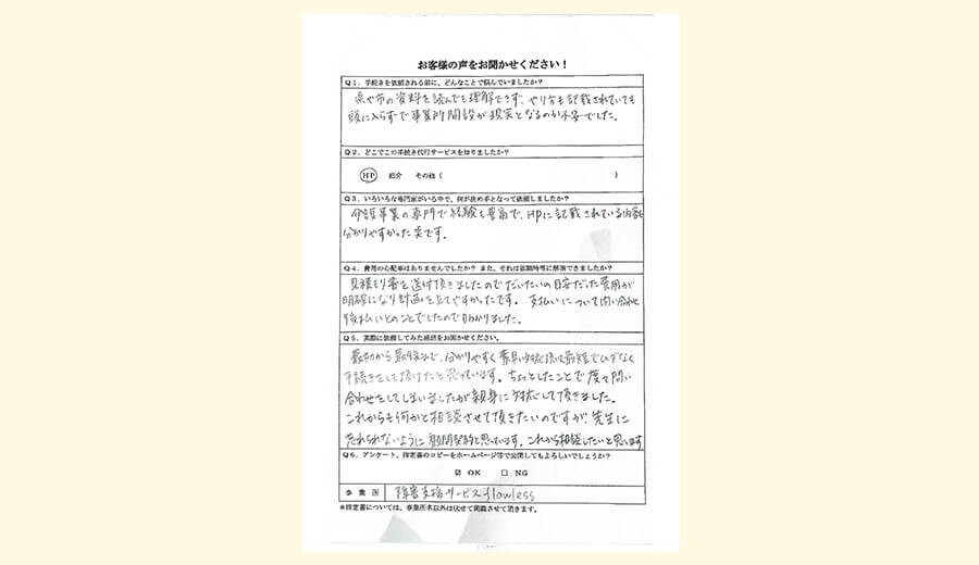 - 県や市の資料を読んでも理解できず、やり方も記載されていても頭に入らずで、事業所開設が現実となるのか不安でした。